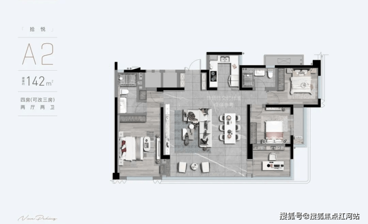 A璟悦(建面约142㎡):四房两厅两卫,餐客厅一体化通透布局,北向约9.4m全景采光面,悦赏满园风光;主卧套房臻配卫生间、衣帽间,尽享尊崇;多功能房可定制为书房、影音室、花房等,满足家庭多元需求。