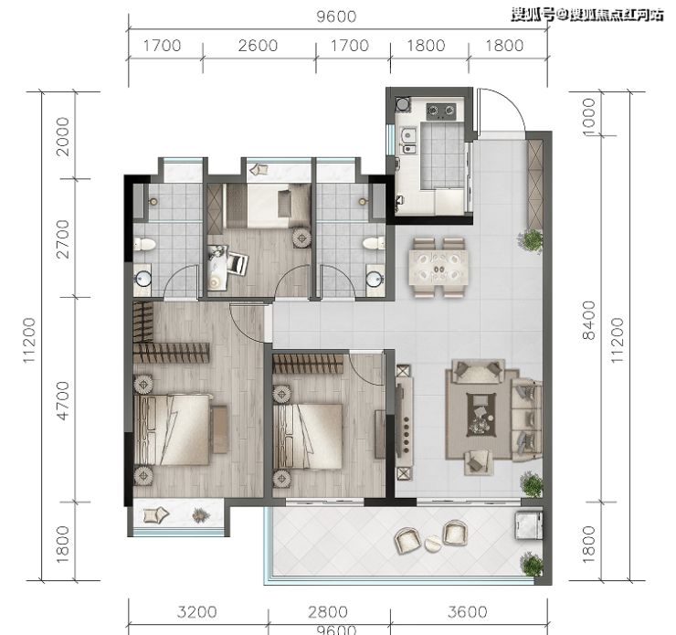 C户型建筑面积104㎡ 三室两厅两卫