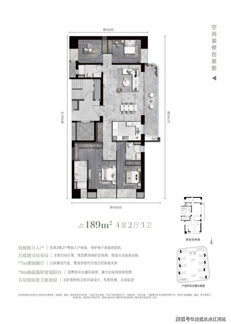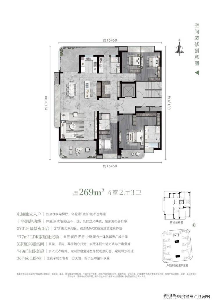 约 18 米大面宽、270° 全景视野,十字洄游动线;客餐厅总面积约 67㎡,1 梯 1 户私梯厅;三阳台 + 四飘窗,主卧超 20㎡,配置独立书房与豪华卫浴。