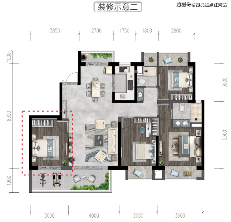 A1户型:建面约168㎡,四室两厅两卫