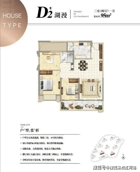 105㎡ 3室2厅2卫:刚改优选户型。东南端户设计,日照充足、视野开阔,双卫布局告别早高峰洗漱拥堵,主卧套房带独立卫浴,私密性拉满,兼顾功能性与舒适度,三口之家居住刚刚好。