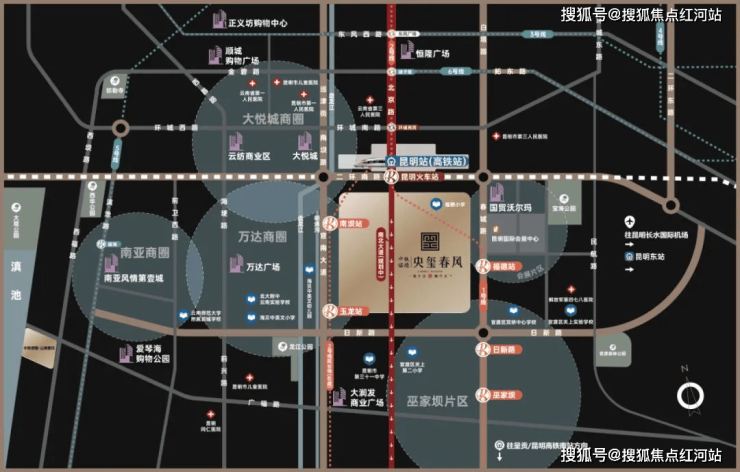 交通配套:紧邻南二环、春城路,步行可达昆明站,直线约500米覆盖地铁1、2号线四座站点,公交路线密集,高铁+地铁+自驾+公交四维出行,畅达全城、接驳全国;教育配套:周边机关二幼公立幼儿园、九年一贯制学校环伺,全龄段公办教育资源齐全,孩子上学步行可达,教育无忧;商业配套:近距离可达万达广场、大悦城、恒隆广场、顺城等主城顶级商圈,木水花市场等便民配套齐全,高端消费与日常购物兼顾;医疗配套:云南省第三人民医院、昆明市人民医院等三甲医院环绕,就医便捷,健康有保障;生态配套:周边公园分布密集,社区内部39%高绿地率,内外双园,宜居舒适。