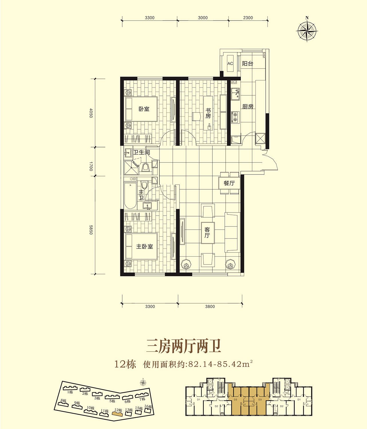 3室2厅2卫-12栋D3使用面积82.14㎡三居户型
