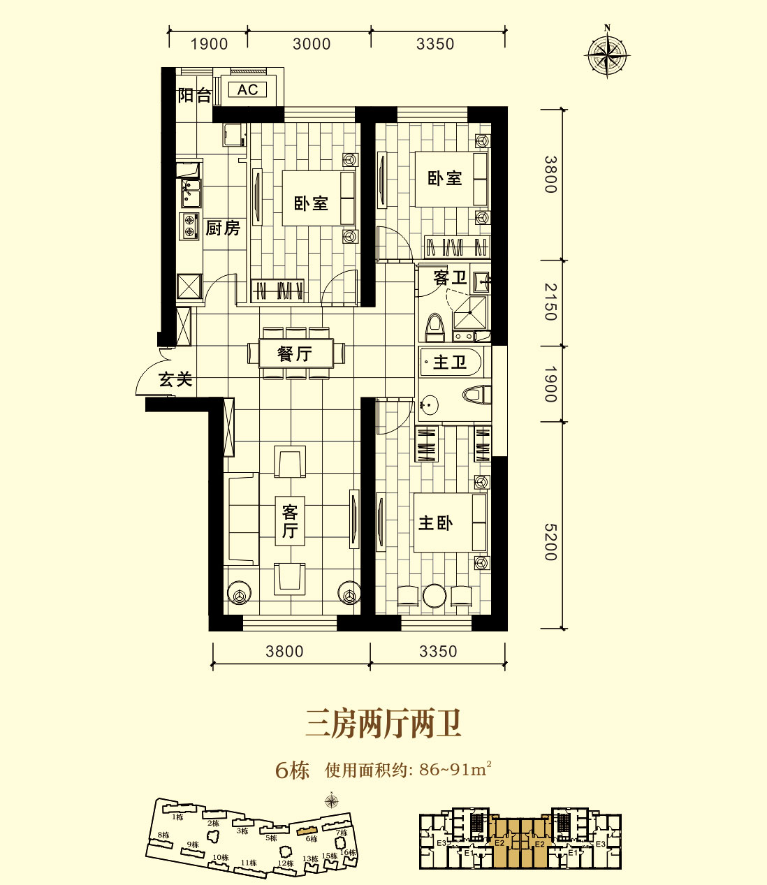 3室2厅2卫-6#E2使用面积86-91㎡三居户型