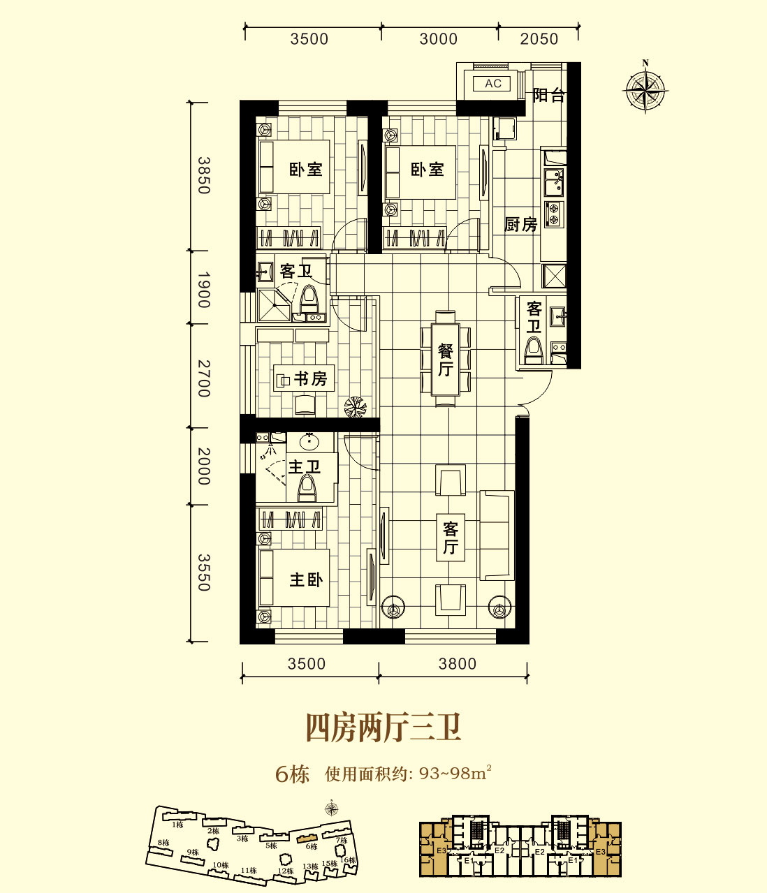 4室2厅3卫-6#E3使用面积93-98㎡四居户型