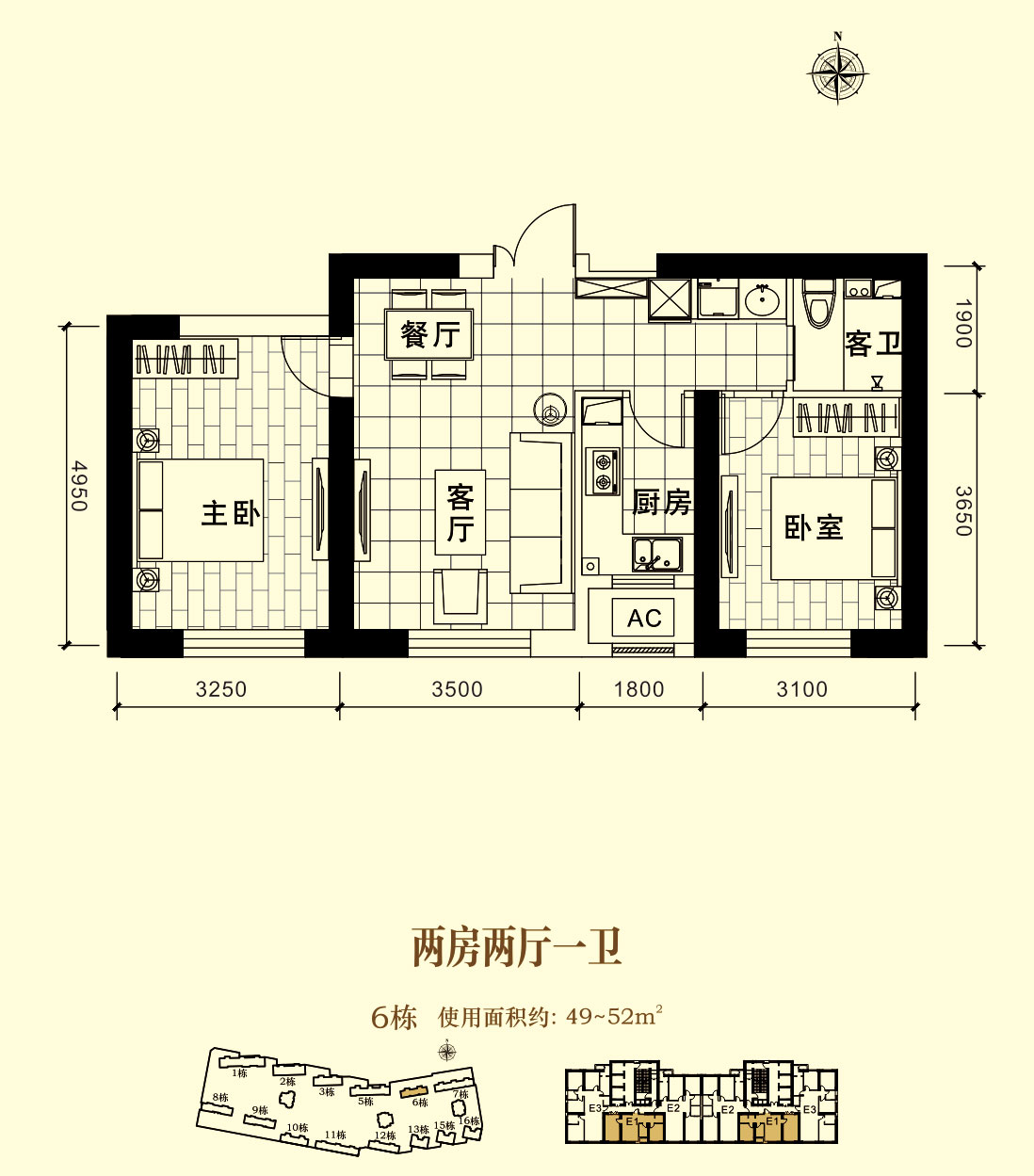 2室2厅1卫-6#E1使用面积49-52㎡两居户型