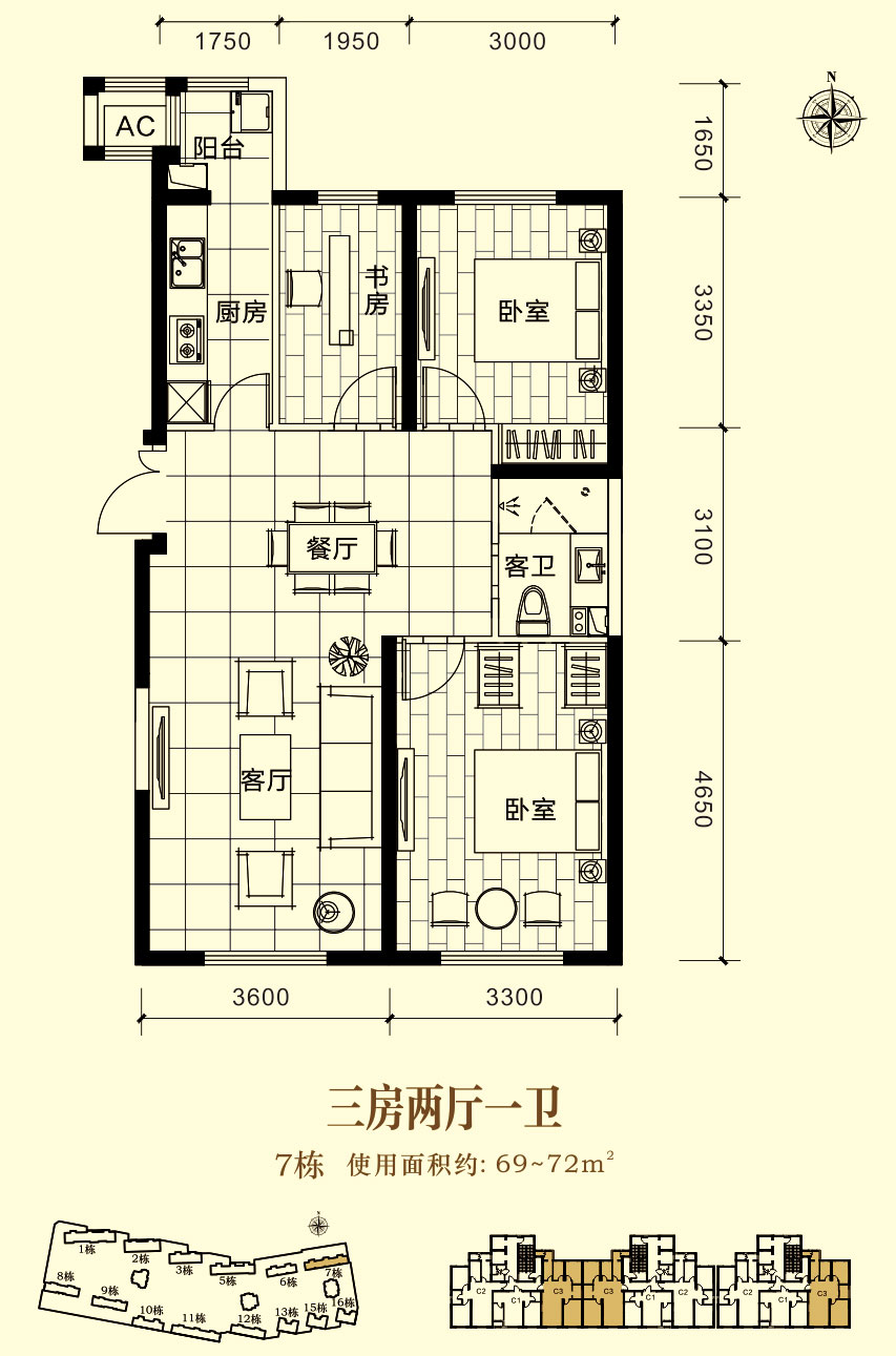 3室2厅1卫-7#C3使用面积69-72㎡三居户型