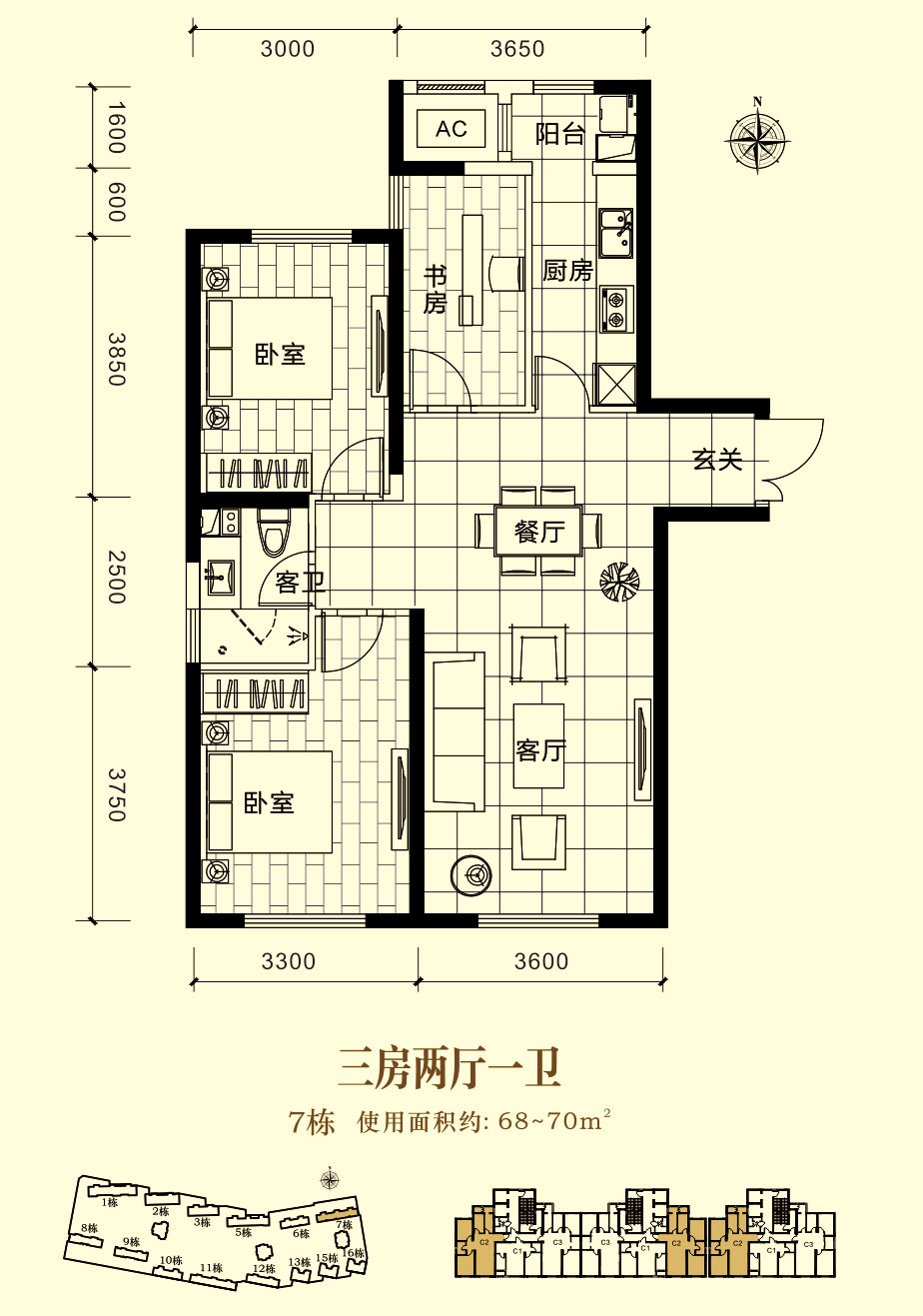 3室2厅1卫-7#C2使用面积68-70㎡三居户型