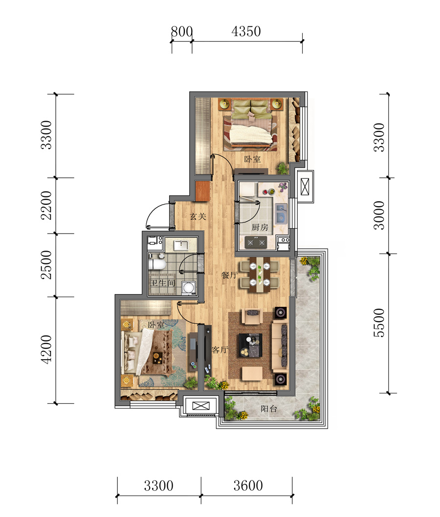 2室2厅1卫-建面80㎡两居A1户型