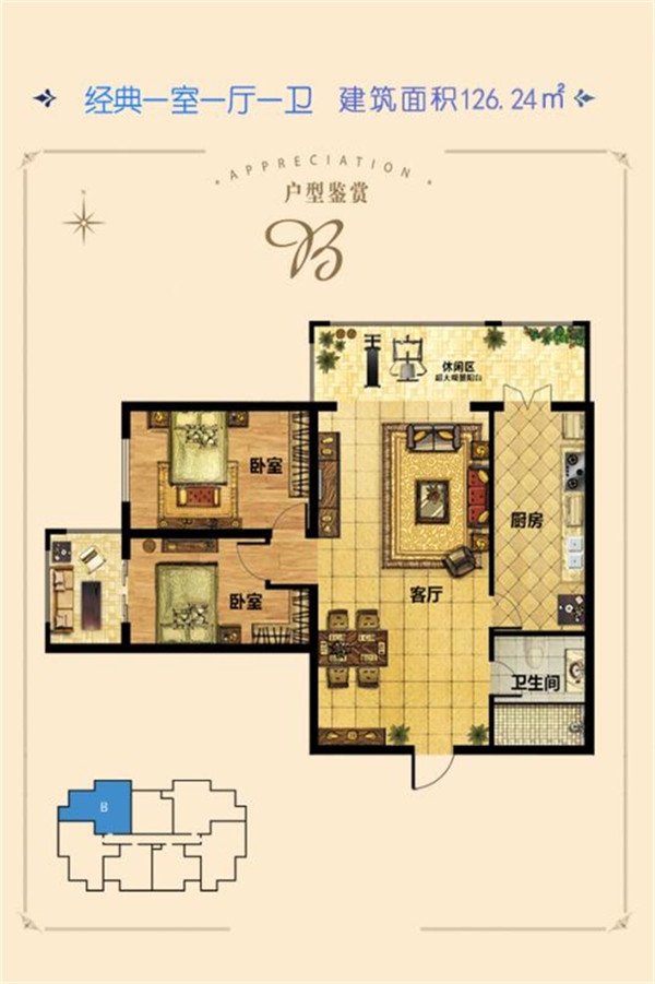 2室2厅1卫-B-建筑面积126.24㎡两居