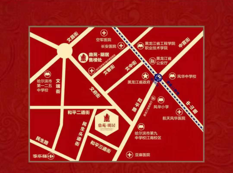 从黑龙江省政府到和平路,行驶360米右转,进入文府街,行驶420米右后方转弯,进入和平二道街,行驶60米左转,进入民生头道街,行驶80米左侧即为项目。