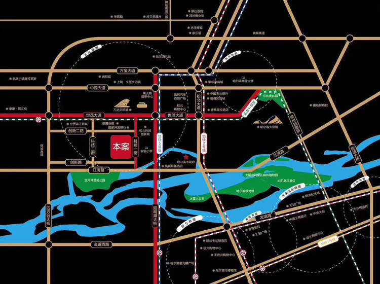 汇宏金融港项目地处国家第十六个经济开发区-------松北新区,坐落于科技创新城的核心板块,享有松北区天然氧吧的生态环境,与金河湾湿地公园一道之隔,是为数不多的观江地块。项目北邻万达城,直线距离仅700米,是由雪花东路、创新路、科技一街、创新二路围合而成,周边配套齐全,工作生活便利,是便捷型办公SHOH LOFT典范。