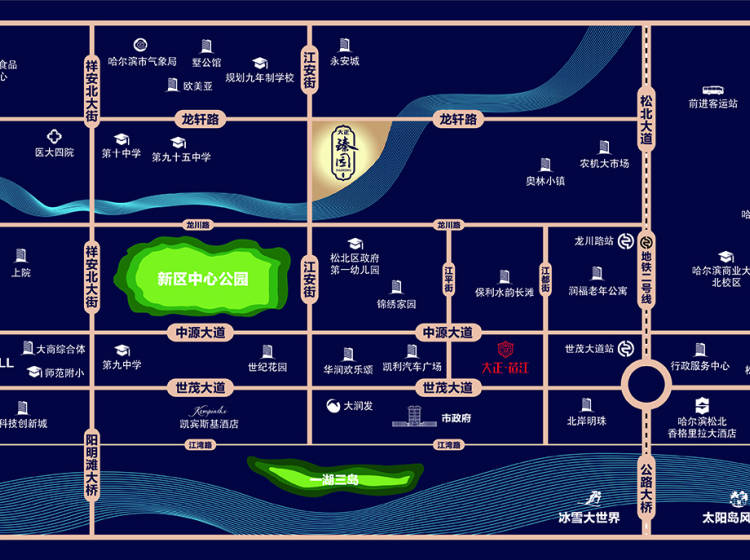 由公路大桥上桥向松北方向行驶,沿松北大道直行8公里,左转进入龙川路,直行700米右转,直行1.5公里,左侧即为项目。