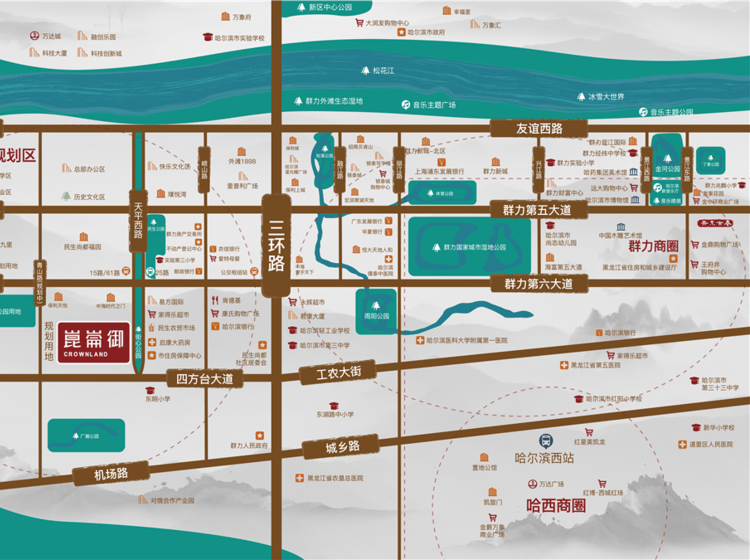 华润置地崑崙御Ⅱ期项目地处群力新区,位于哈尔滨西部、松花江上游,城市上风向。北濒美丽的松花江,南至哈双北路靠近机场高速公路,西至城市四环紧邻哈尔滨市著名的长岭湖风景旅游度假区,东至城市二环快速道,与城市中心区紧密相邻。