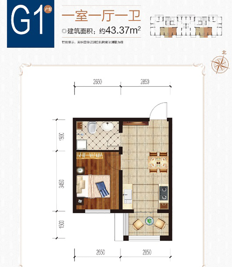 1室1厅1卫-二期小高层建面43.37㎡一室一厅一卫
