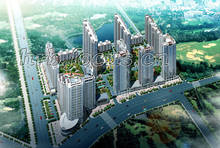 盟科观邸社区是一个复合型的大社区,产品多元化。分为A、B、C三个区域。A区共4栋高层,集公寓、商住、星级宾馆、高层住宅为一体;B区由5栋板式高层住宅组成;C区分布4栋板式高层和3栋小多层住宅。其中,高层以正南北朝向纯板式结构为主,楼体错落有秩,空间变换开合适度。整个建筑风格现代、明快,中式的传统元素渗透其中,简约而不失古典气息。