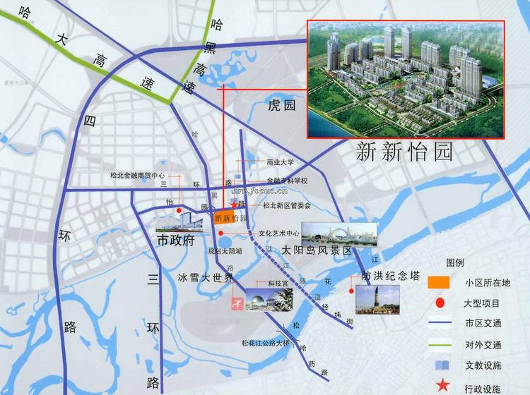 新新怡园观天下位于松花江北岸,未来的城市中心黄金点,北邻怡园路,西临哈黑公路,南邻规划中的哈尔滨文化艺术中心和哈尔滨松花江太阳湖,占地面积12.47公顷,规划总建筑面积20.6万平方米。与哈尔滨市政府隔路相望,交通便利,环境优美,空气清新。