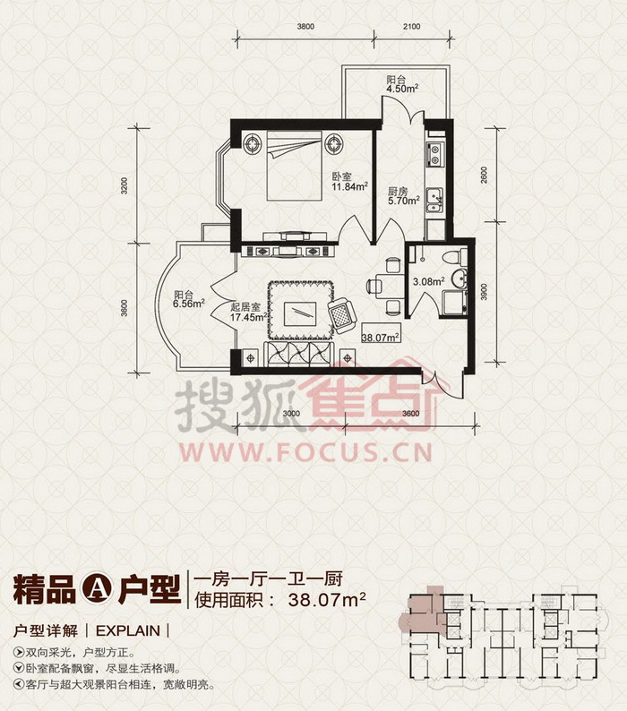 1室1厅1卫-金泰湖滨绿茵三期一房一厅一卫一厨38.07㎡户型