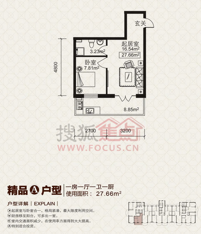 1室1厅1卫-金泰湖滨绿茵三期一房一厅一卫一厨27.66㎡户型