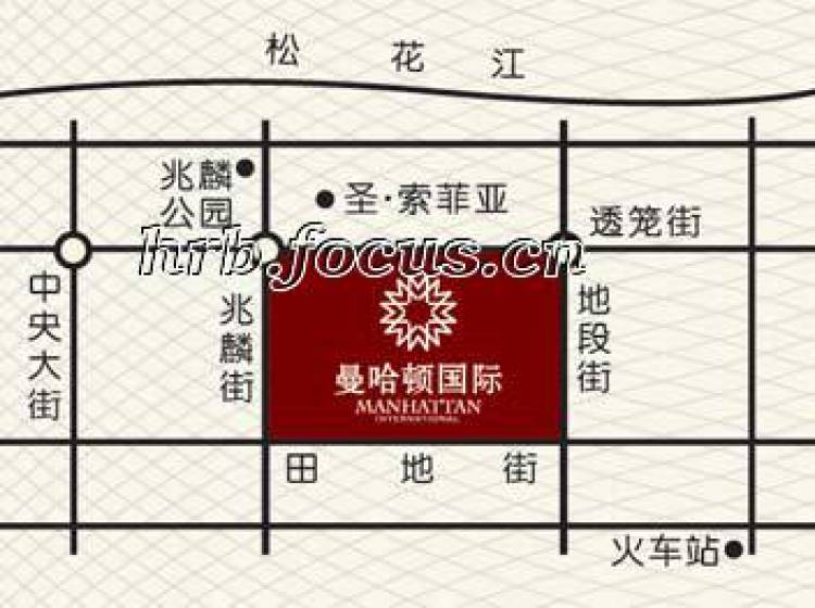 曼哈顿国际是2009年曼哈顿集团的重点开发项目,位于道里区透笼街与兆麟街交汇处,兆麟街71号,项目地处城市中心,雄踞百年道里商圈,毗邻圣?索菲亚教堂,曼哈顿国际与现有的曼哈顿商厦一、二期工程和曼哈顿商务酒店形成围合结构,欧式立面风格,浑然一体。建筑形式为塔式高层建筑,总建筑面积28707㎡,是一栋集公寓、酒店、会所、餐饮、购物、休闲于一体的综合型建筑。其中B1层为停车场,地上F1-F6层为曼哈顿精品商城,F7层为高档会所,F8-F22层为酒店式公寓。其中商场将于2010年中旬营业,酒店式公寓在2010年12月底正式进户。