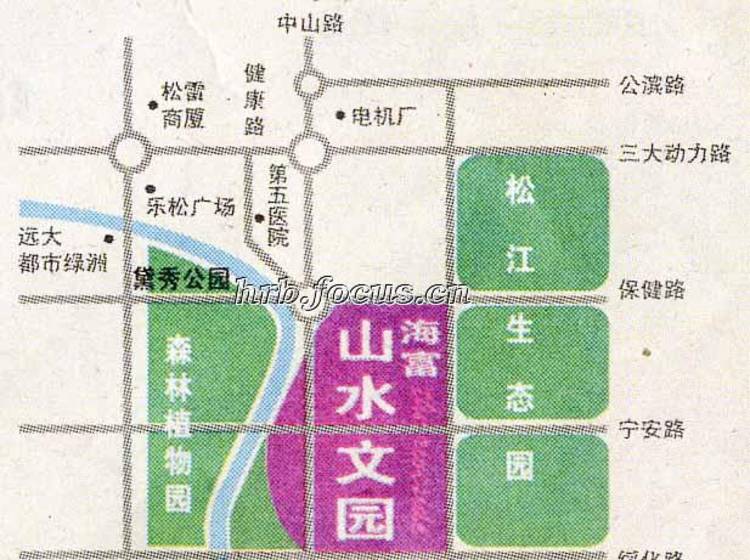 海富山水文园位于香坊区旭升街、电塔街(三合路)、打通的保健路围合区域内。背倚森林植物园百万园林和马家沟六万水景长廊,面朝拥有数百种珍奇树木的黛秀公园,自然景观得天独厚。