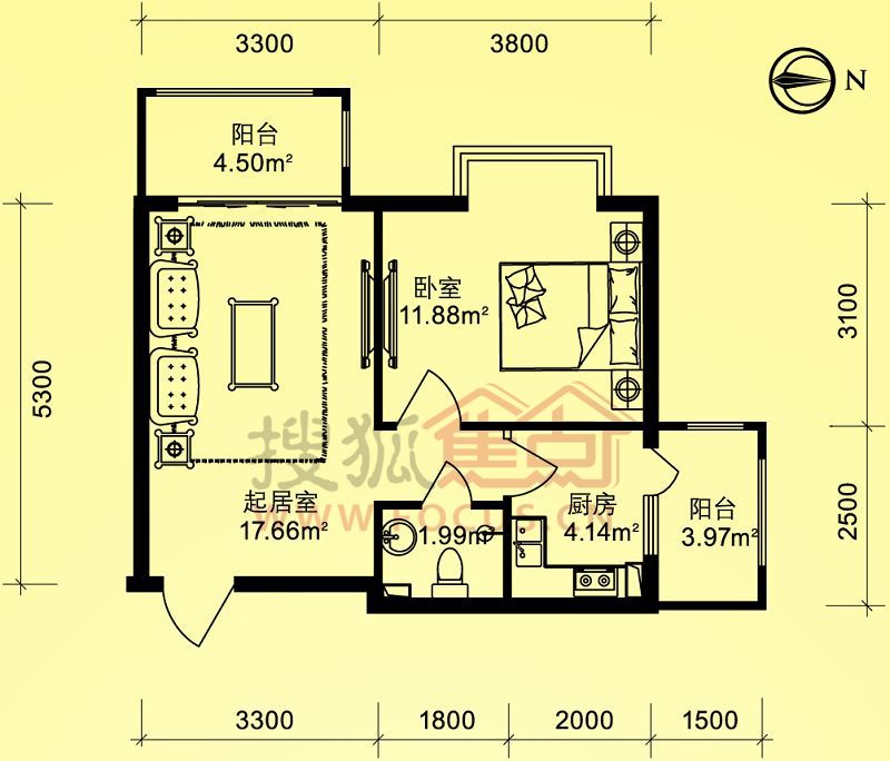 1室2厅1卫-海富金棕榈一室两厅一卫39.69㎡