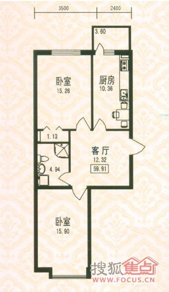 2室2厅1卫-福宏名城户型二2室1厅1卫使用面积59.91㎡