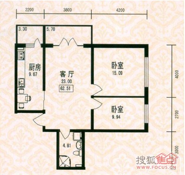 2室1厅1卫-福宏名城户型一 2室1厅1卫使用面积62.51㎡