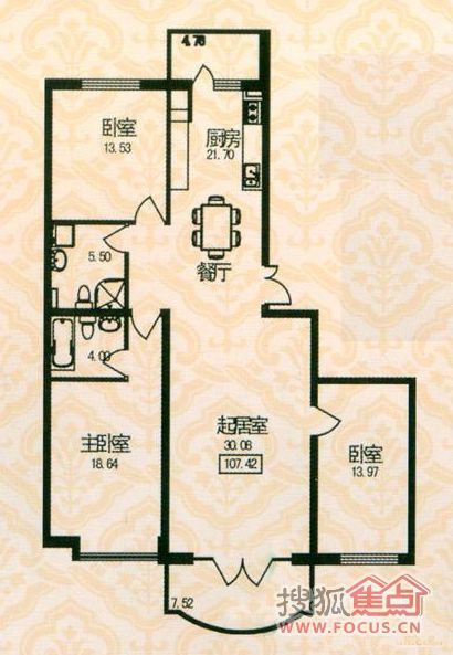 3室1厅2卫-福宏名城户型五3室1厅2卫使用面积107.42㎡