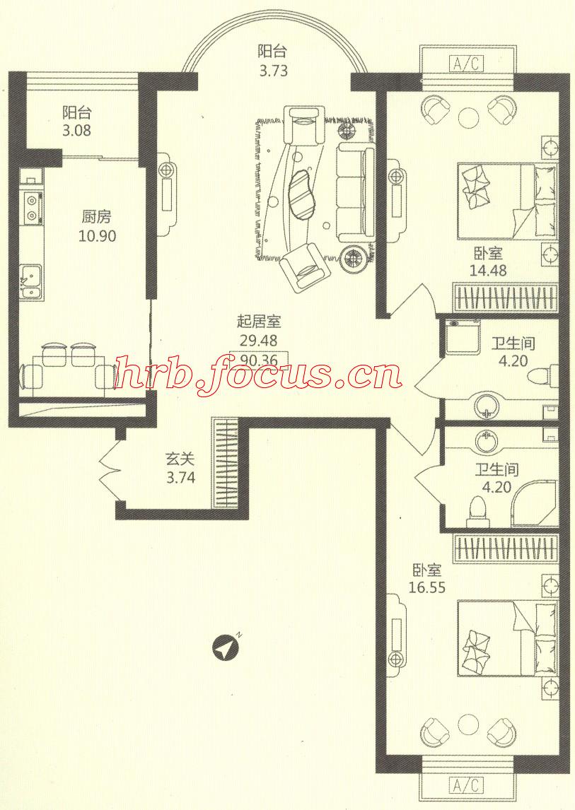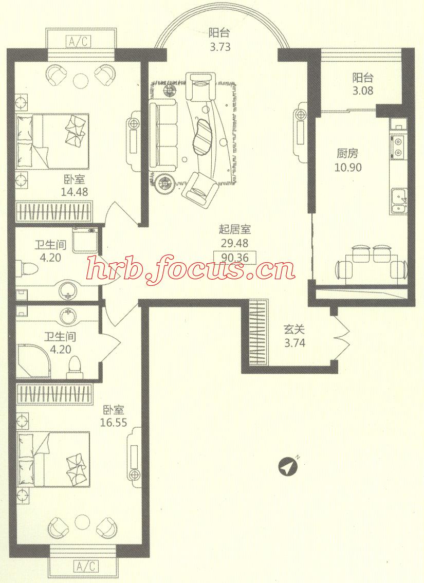 2室1厅2卫-华风海城湾2#3#楼1单元04 90.36㎡户型