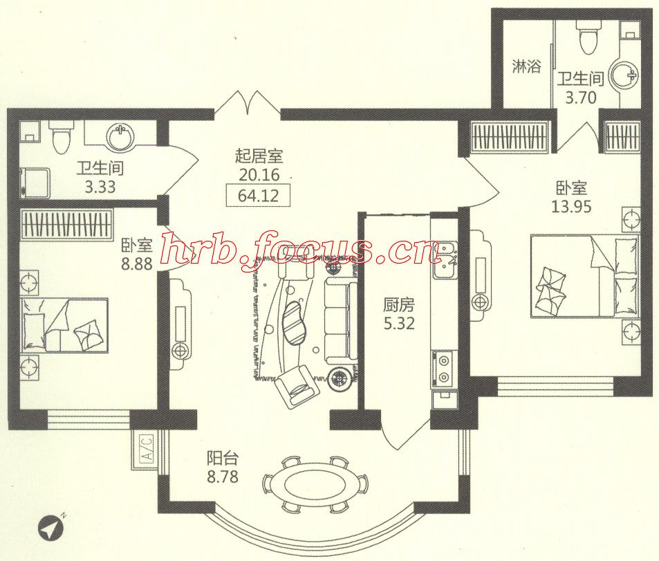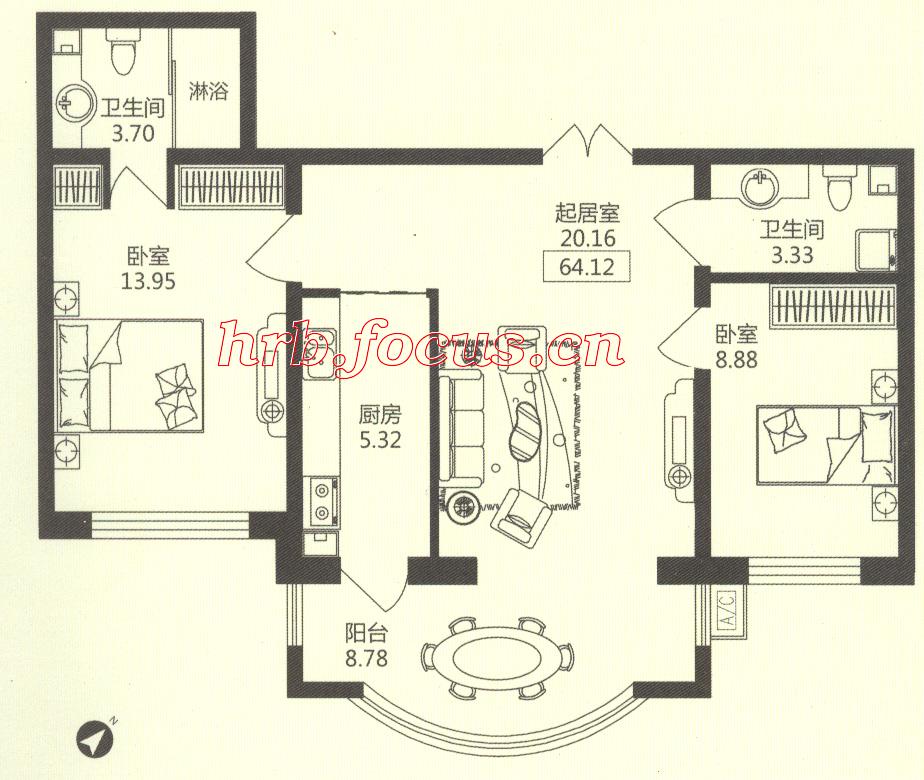 2室1厅2卫-华风海城湾2#3#楼1单元03 64.12㎡户型