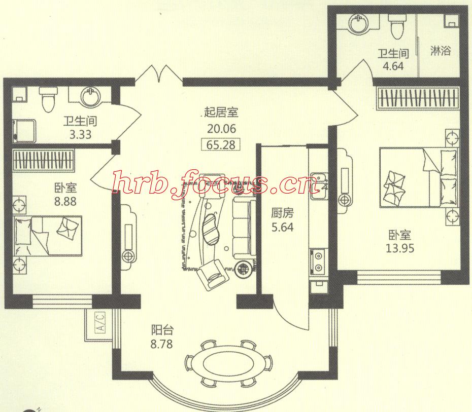 2室1厅2卫-华风海城湾2#3#楼1单元02 65.28㎡户型