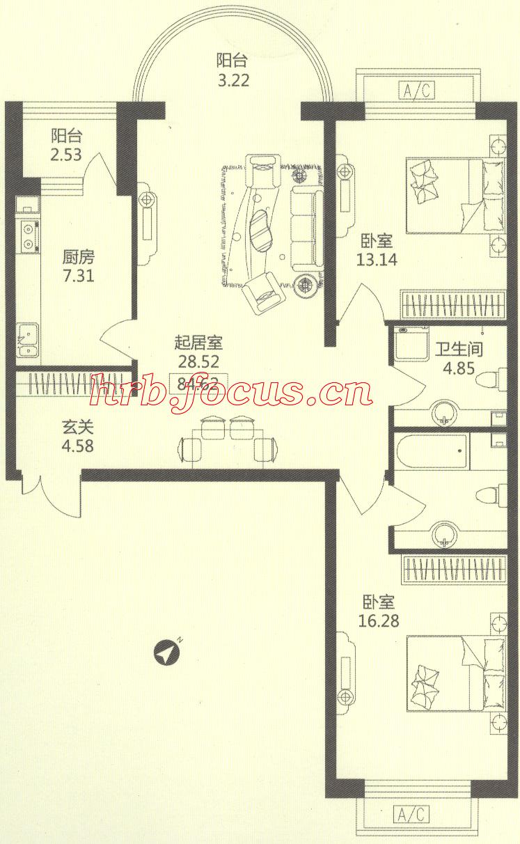 2室1厅2卫-华风海城湾1#楼1单元04 84.62㎡户型
