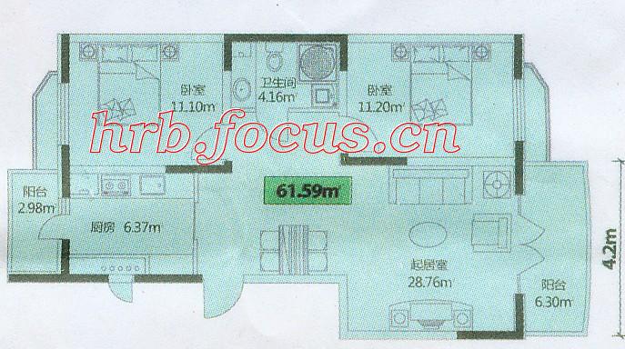 2室1厅1卫-宏伟华轩两室一厅61.59㎡