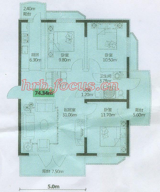 3室1厅1卫-宏伟华轩三室一厅74.34㎡