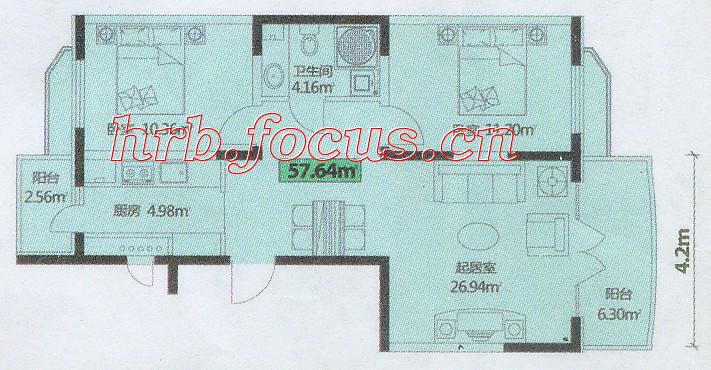 2室1厅1卫-宏伟华轩两室一厅57.64㎡