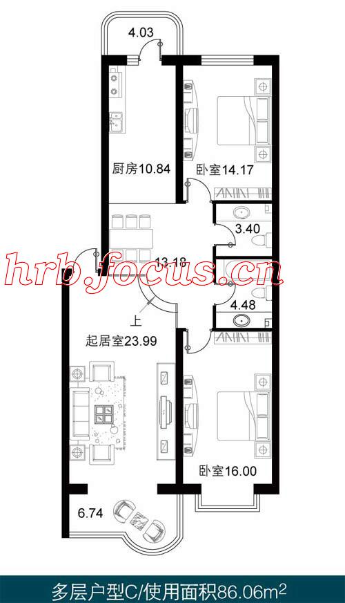 2室1厅2卫-宝融上元府邸(多层户型C)两室一厅两卫86.06㎡