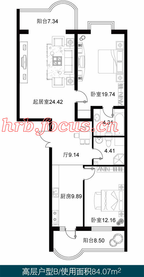 2室2厅2卫-宝融上元府邸(高层户型B)两室二厅两卫84.07㎡