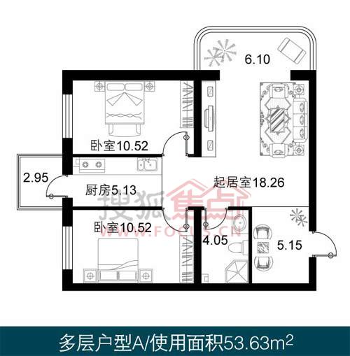 2室2厅1卫-宝融上元府邸(多层户型A)两室两厅一卫53.63㎡