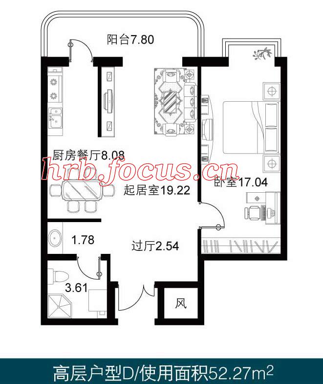 1室1厅1卫-宝融上元府邸(高层户型D)一室一厅一卫52.27㎡