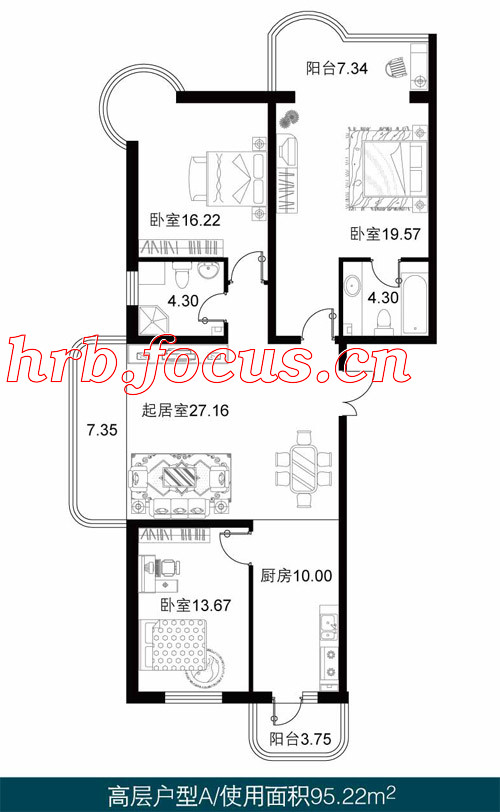 3室1厅2卫-宝融上元府邸(高层户型A)三室一厅两卫95.22㎡