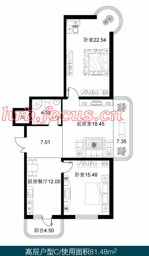 2室1厅1卫-宝融上元府邸(高层户型C)两室一厅一卫81.48㎡