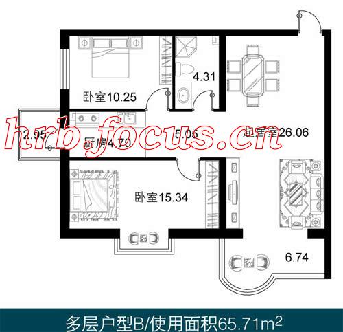 2室1厅1卫-宝融上元府邸(多层户型B)两室一厅一卫65.71㎡