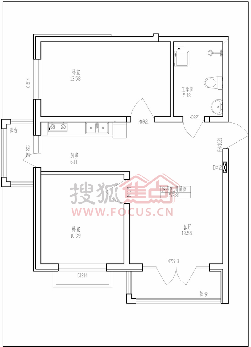 2室1厅1卫-南郡凤凰湾两室一厅一卫53.81㎡