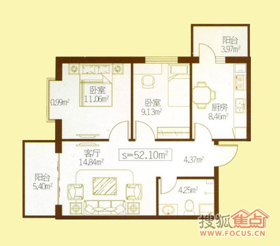 2室1厅1卫-两室一厅一卫一厨52.10㎡