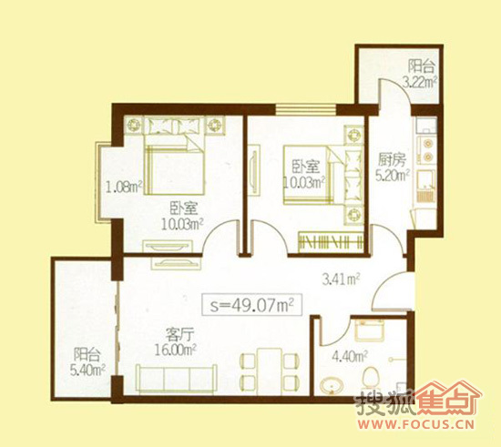 2室1厅1卫-两室一厅一卫一厨49.07㎡