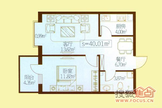 1室2厅1卫-一室两厅一卫一厨40.01㎡