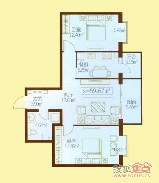 2室1厅1卫-两室一厅一卫一厨59.67㎡