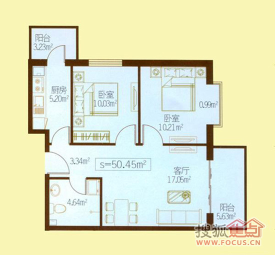 2室1厅1卫-两室一厅一卫一厨50.45㎡