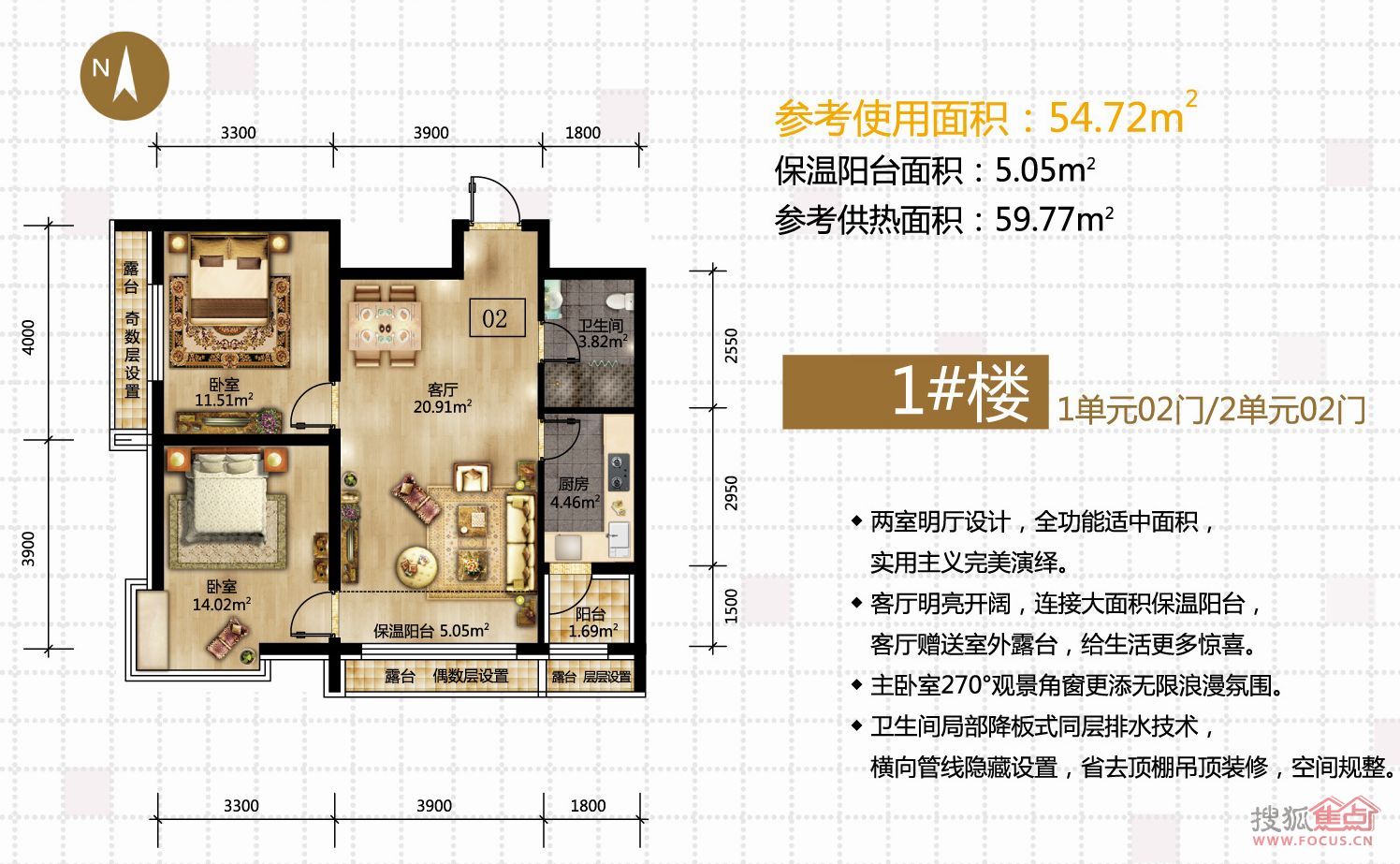 2室1厅1卫-富达蓝山1#楼两室一厅一卫54.72㎡